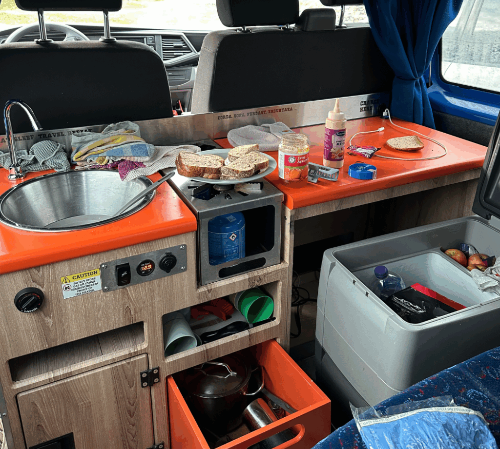 Depending on what kind of campervan you rent, you will most likely at least have a little stove, water, and a fridge/cooler in it. We skipped eating out very much and just stuck to things like peanut butter and jelly sandwiches, turkey sandwiches, & ramen. That helped save us a ton of money!